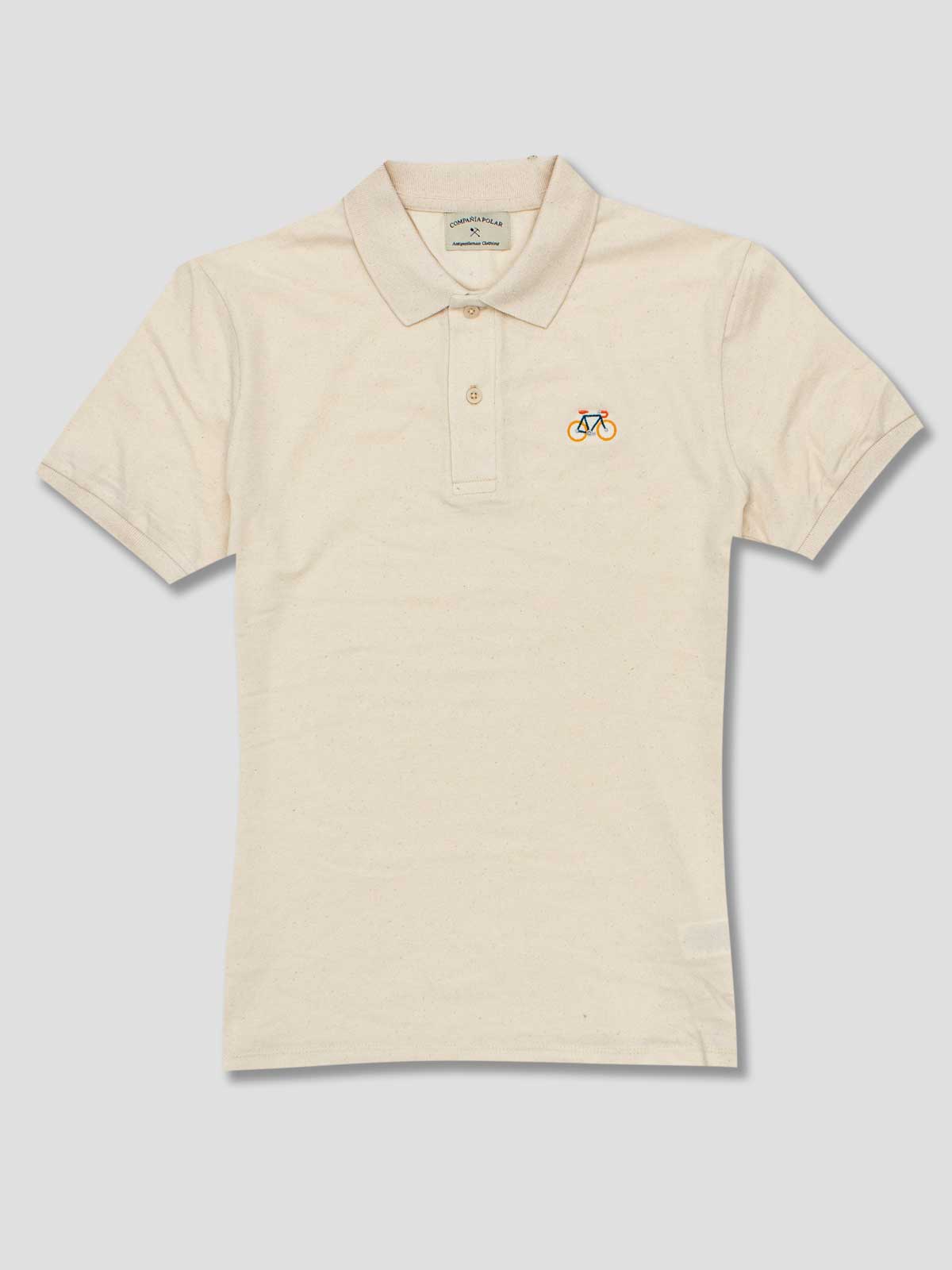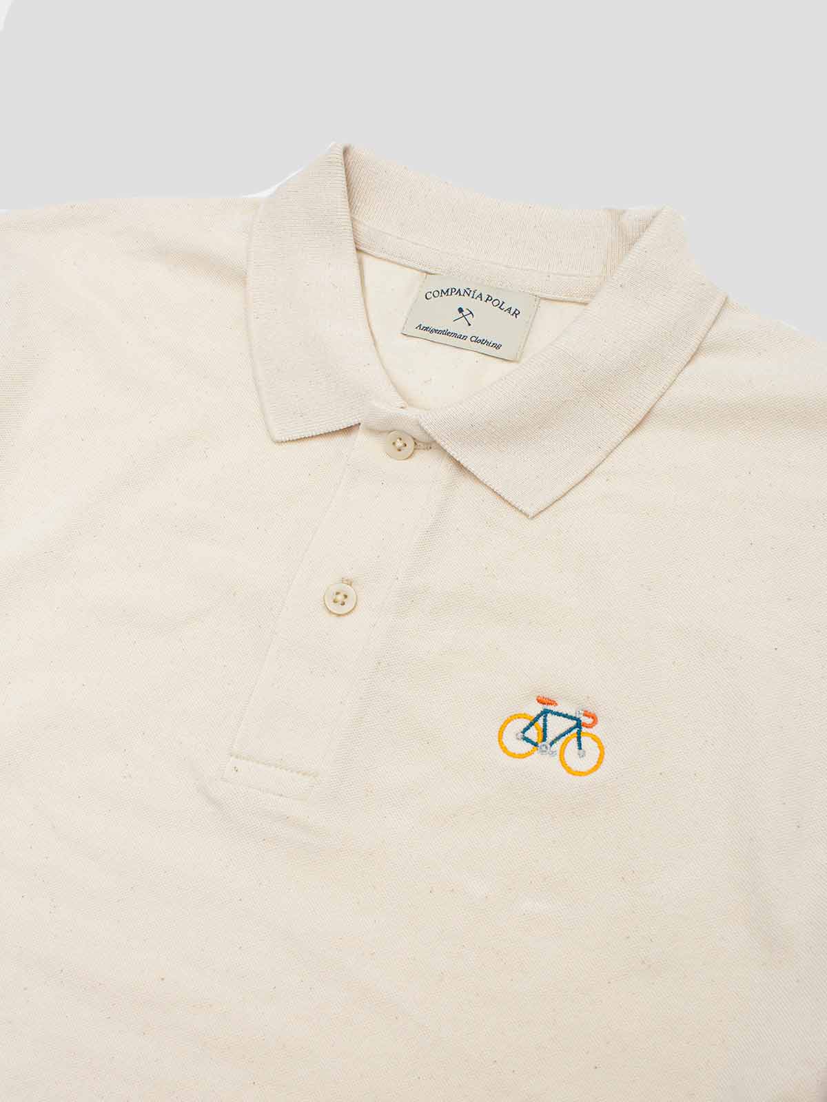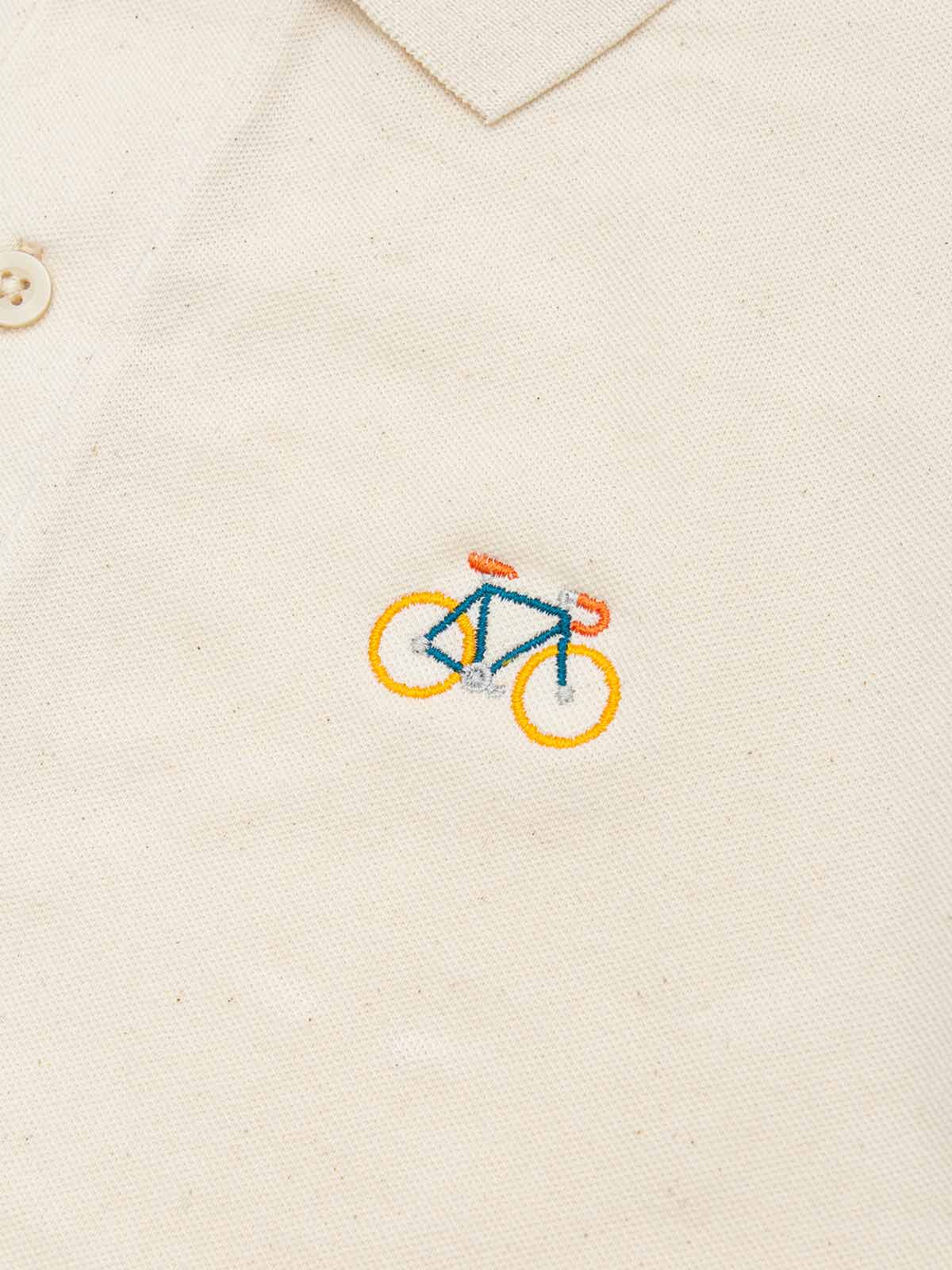 Polo con bordado multicolor de una bicicleta a la altura del pecho.Está elaborado con algodón orgánico y producida en talleres Fair Trade.