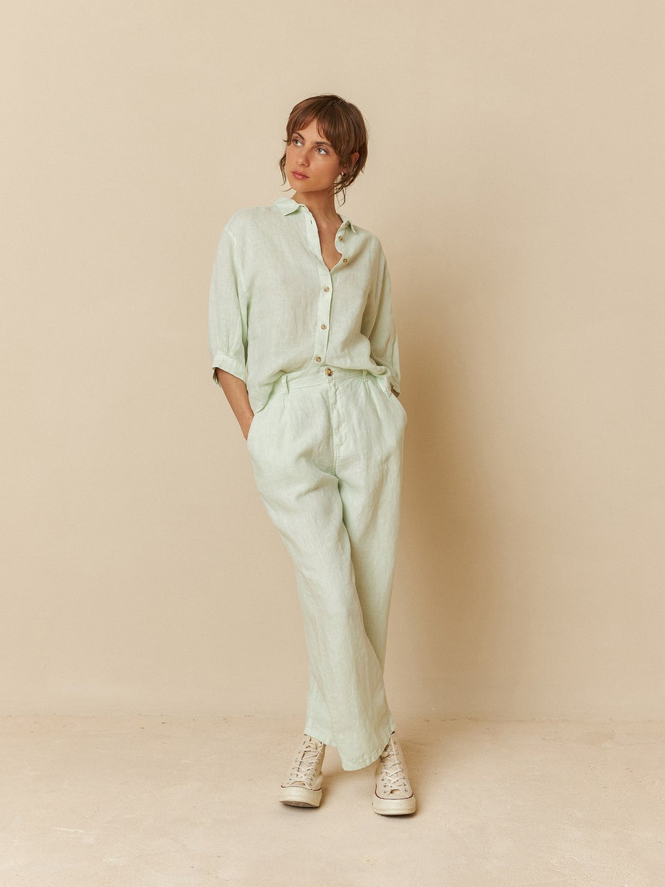 Esta camisa 100% de lino es una pieza esencial en cualquier armario. Puedes combinarla con el pantalón Jared para un total look o con un vaquero. Además, está hecha en España.