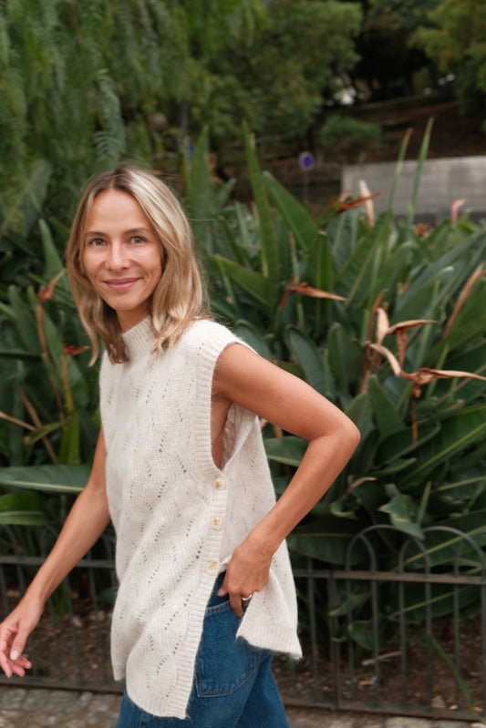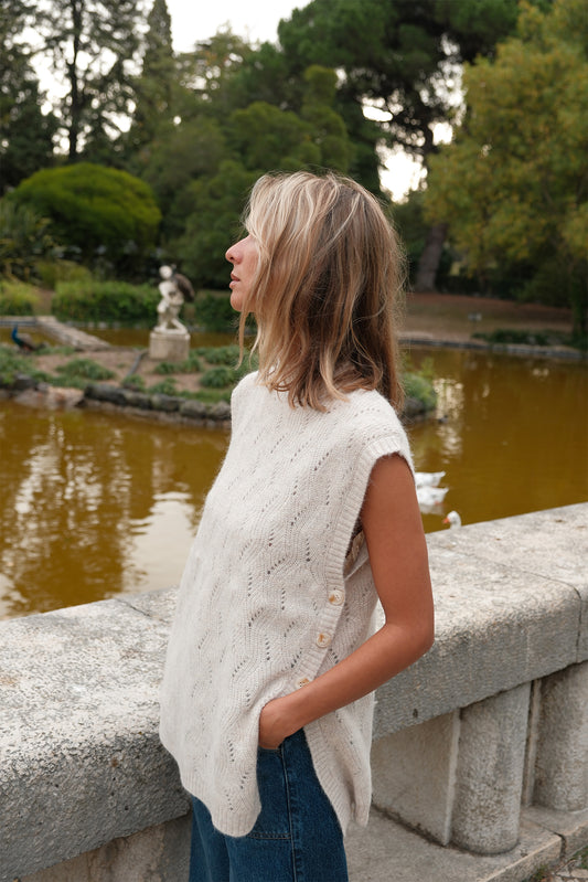 Chaleco de punto fantasía de punto con alpaca, con cuello subido y cierre de botones en los laterales. También tiene aberturas y es perfecta para vestirla encima de una camisa romántica.