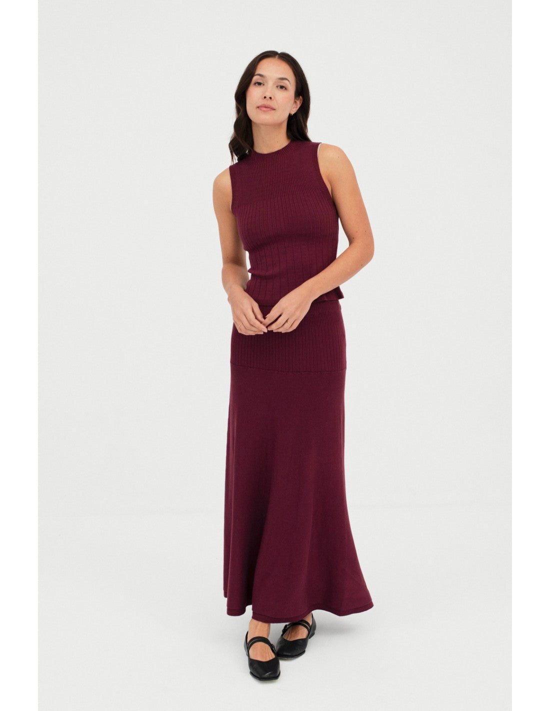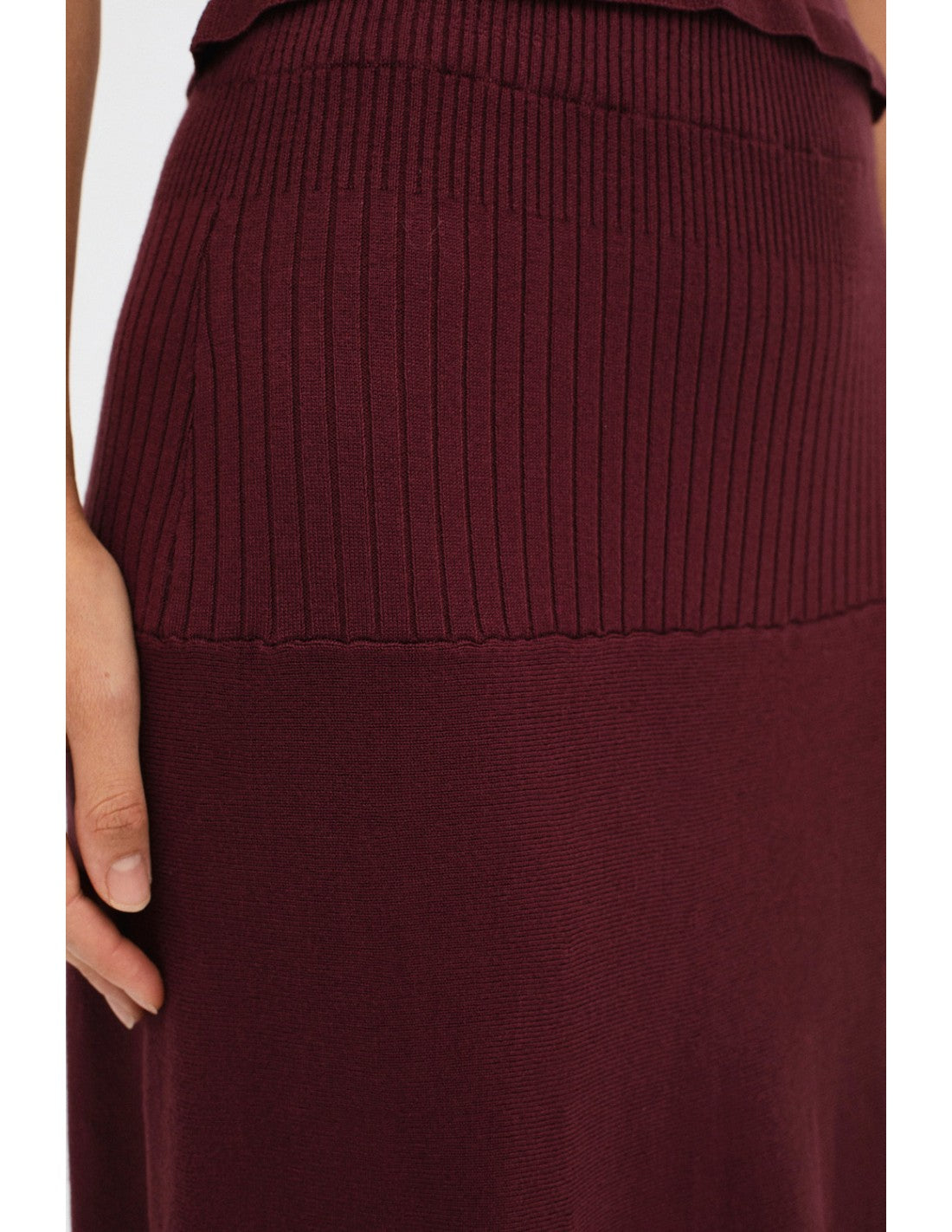 Falda de punto con goma elástica interior en la cintura para un ajuste cómodo. Se compone de diferentes canalés en la zona de las caderas, con un acabado de fantasía en el bajo. Combina con el top Seef para un total look.