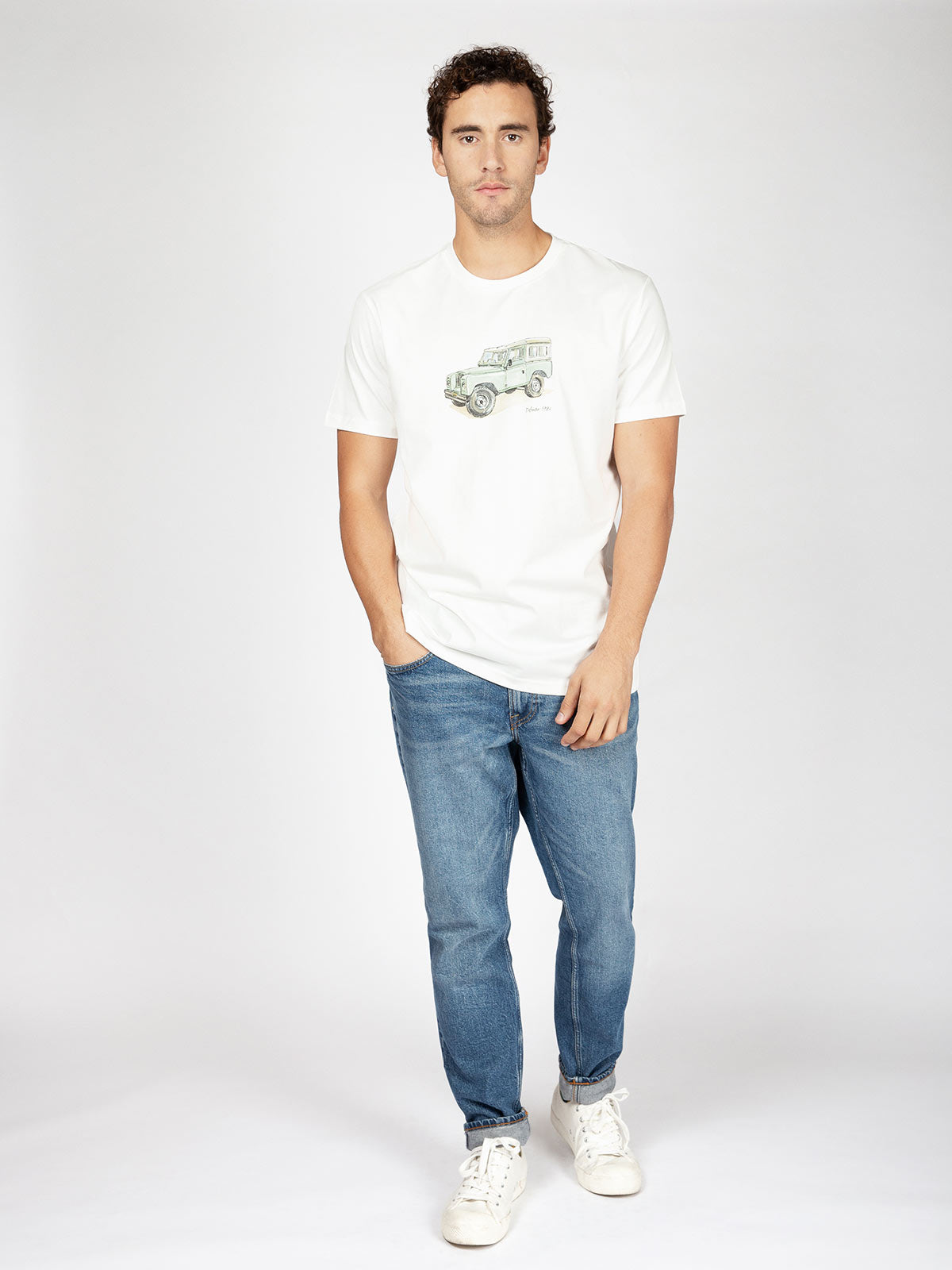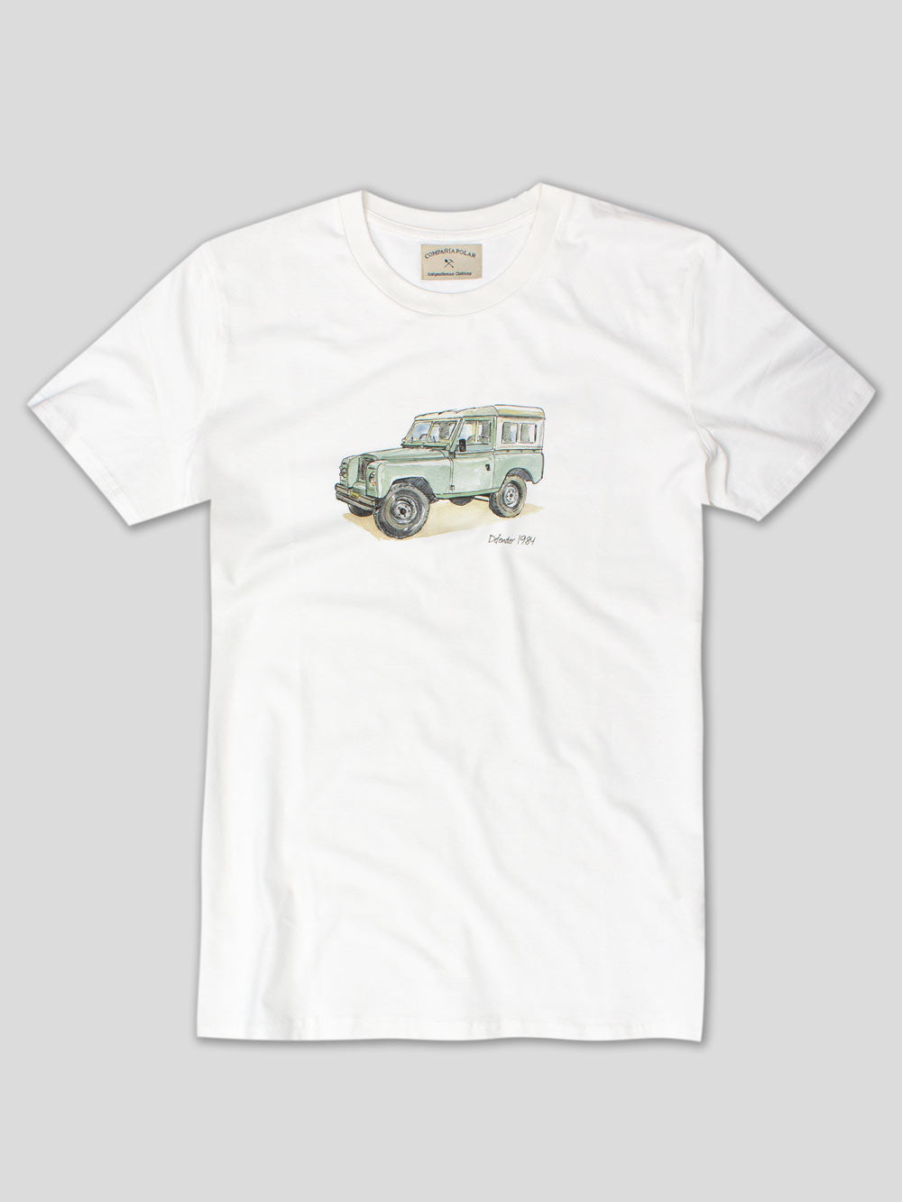 Camiseta ilustrada con el mítico Land Rover Defender en estilo de acuarela. Esta prenda está elaborada en talleres Fair Trade con un suave y resistente algodón orgánico.