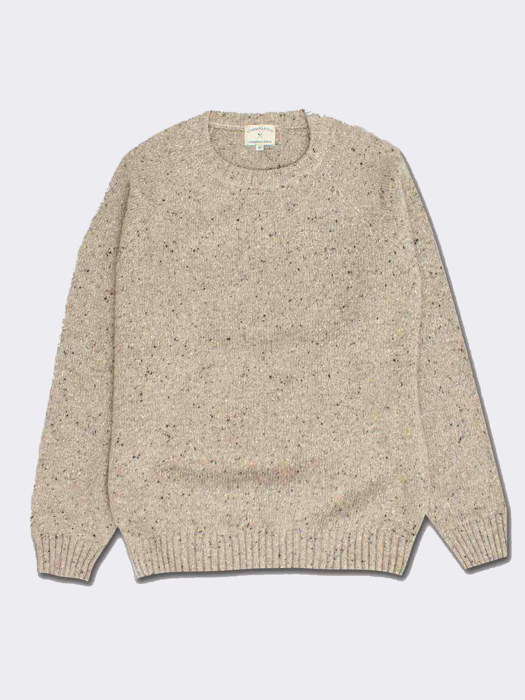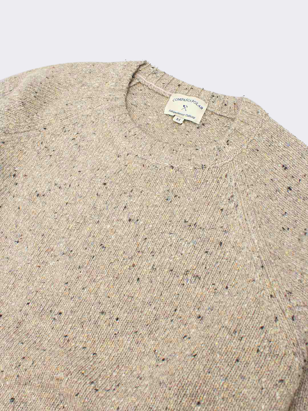 Jersey de lana ecológica moteada con cuello de caja. El patrón tiene un ajuste intermedio, no es ceñido pero tampoco es ancho, y con manga ranglan, lo que de le da un aire más sport. Si dudas entre dos tallas elige la más grande