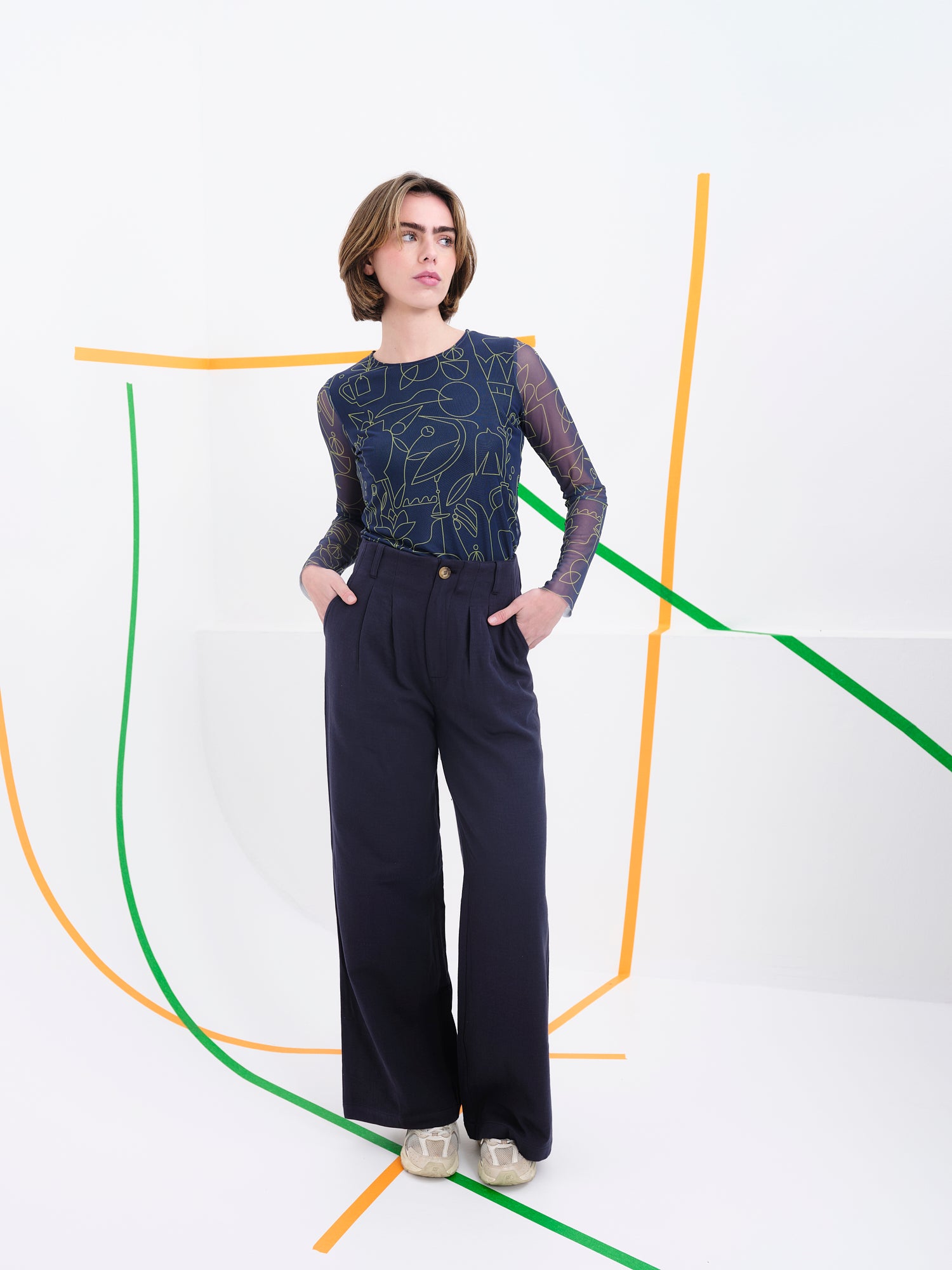 Este pantalón de talle alto es una pieza clave para construir looks con carácter y elegancia relajada. Su corte amplio y estructurado aporta una silueta fluida que estiliza sin perder comodidad. La cintura alta define la figura y permite jugar con proporciones, ideal para combinar con tops ajustados o camisas oversize.Confeccionado en un tejido de algodón, este diseño transmite una estética contemporánea y versátil, perfecta tanto para el día a día como para entornos creativos.