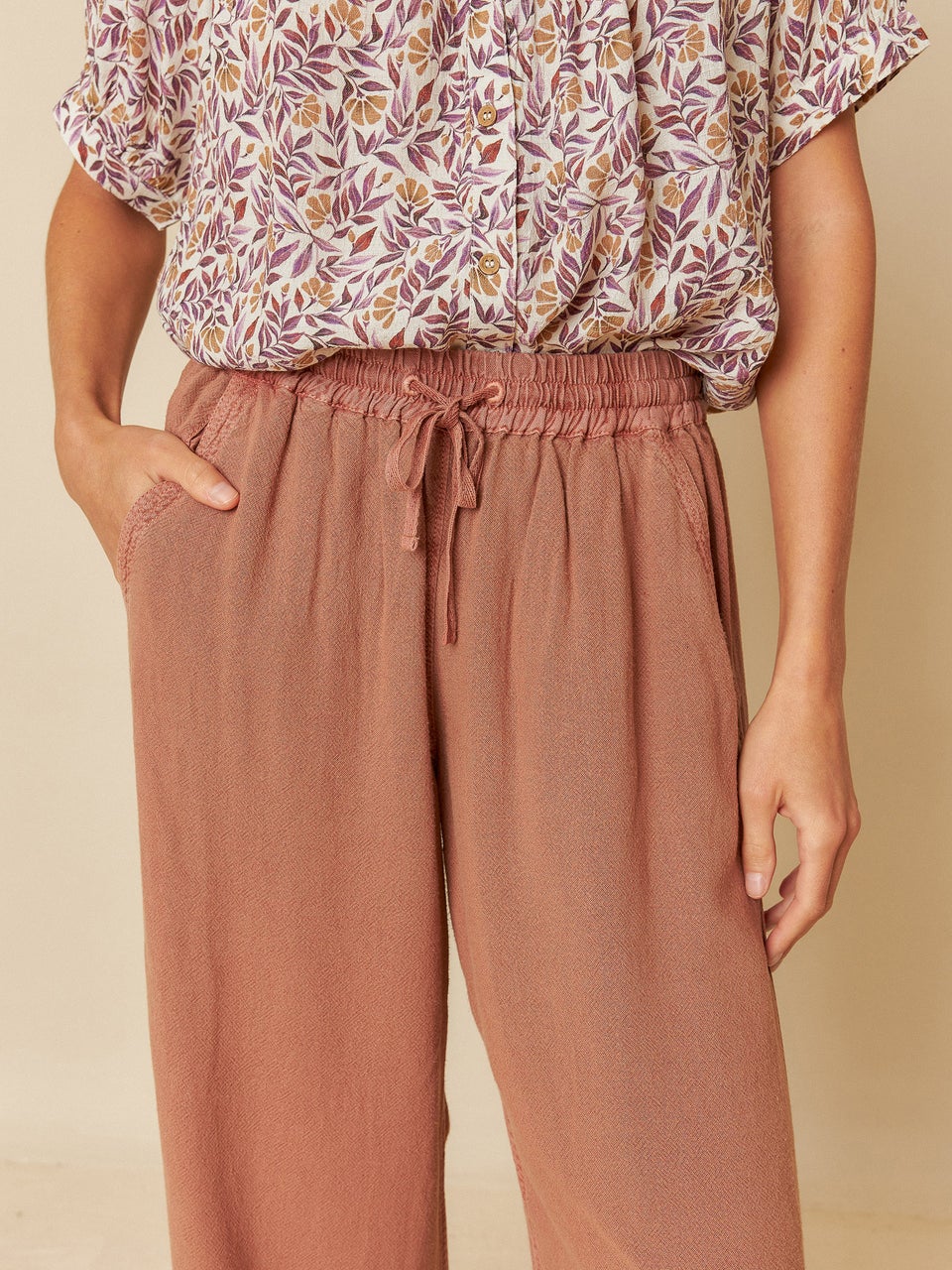 Pantalón de tiro medio y cinturilla elástica con lazada ajustable, bolsillos delanteros de corte francés y bolsillos traseros de parche. Tejido de viscosa y lino con tinte en prenda y efecto lavado y fit relajado.