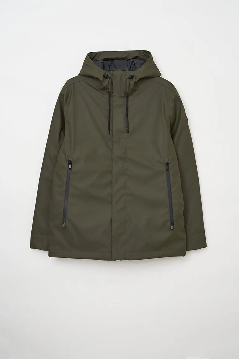 Chaqueta impermeable de hombre  acolchada diseñada para satisfacer las necesidades de un estilo de vida activo. La chaqueta Plas está confeccionada en poliuretano 100% resistente al agua con corte recto. Todas las costuras selladas para una impermeabilización total, cuenta con un acolchado sin plumas y una gran capucha con cordón para protegerte de la lluvia. La parte delantera está equipada con amplios bolsillos y se cierra con una larga cremallera impermeable de doble cursor. Se ajusta a la talla real.