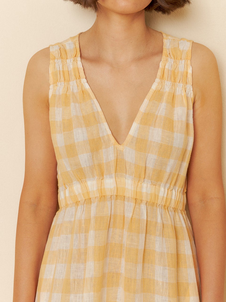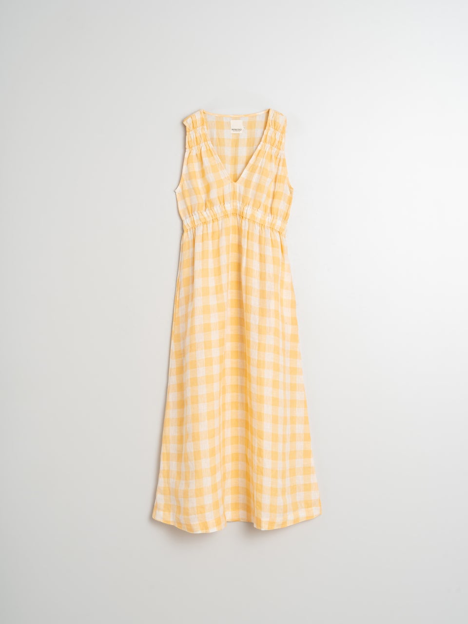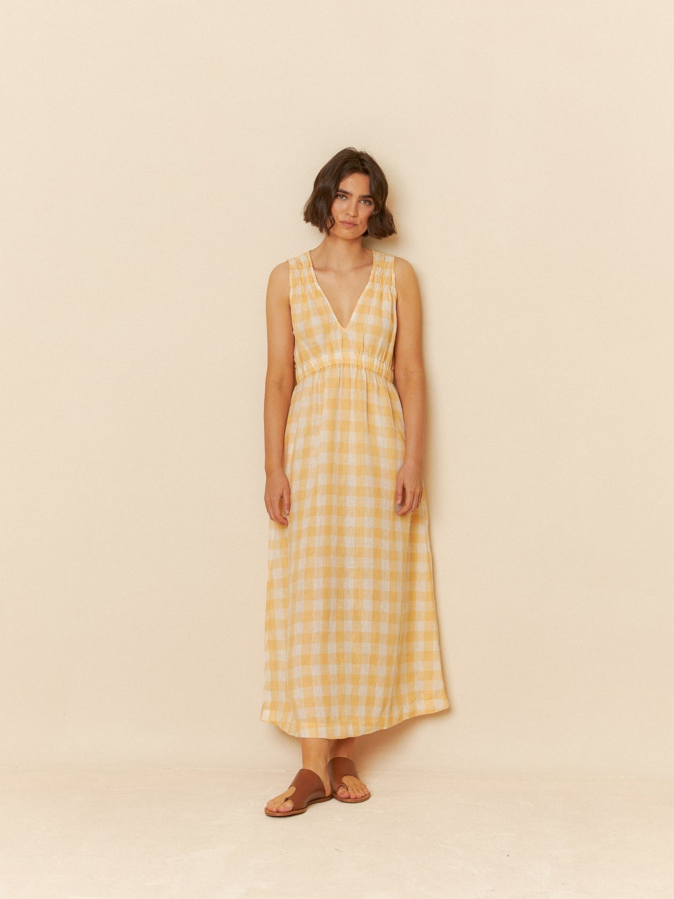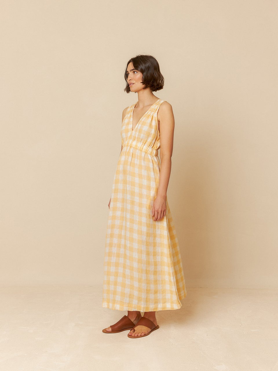 Vestido de corte imperio y engomados en el hombro y debajo del pecho, súper comfy y con un tejido de algodón y lino en cuadro vichy que nos encanta.