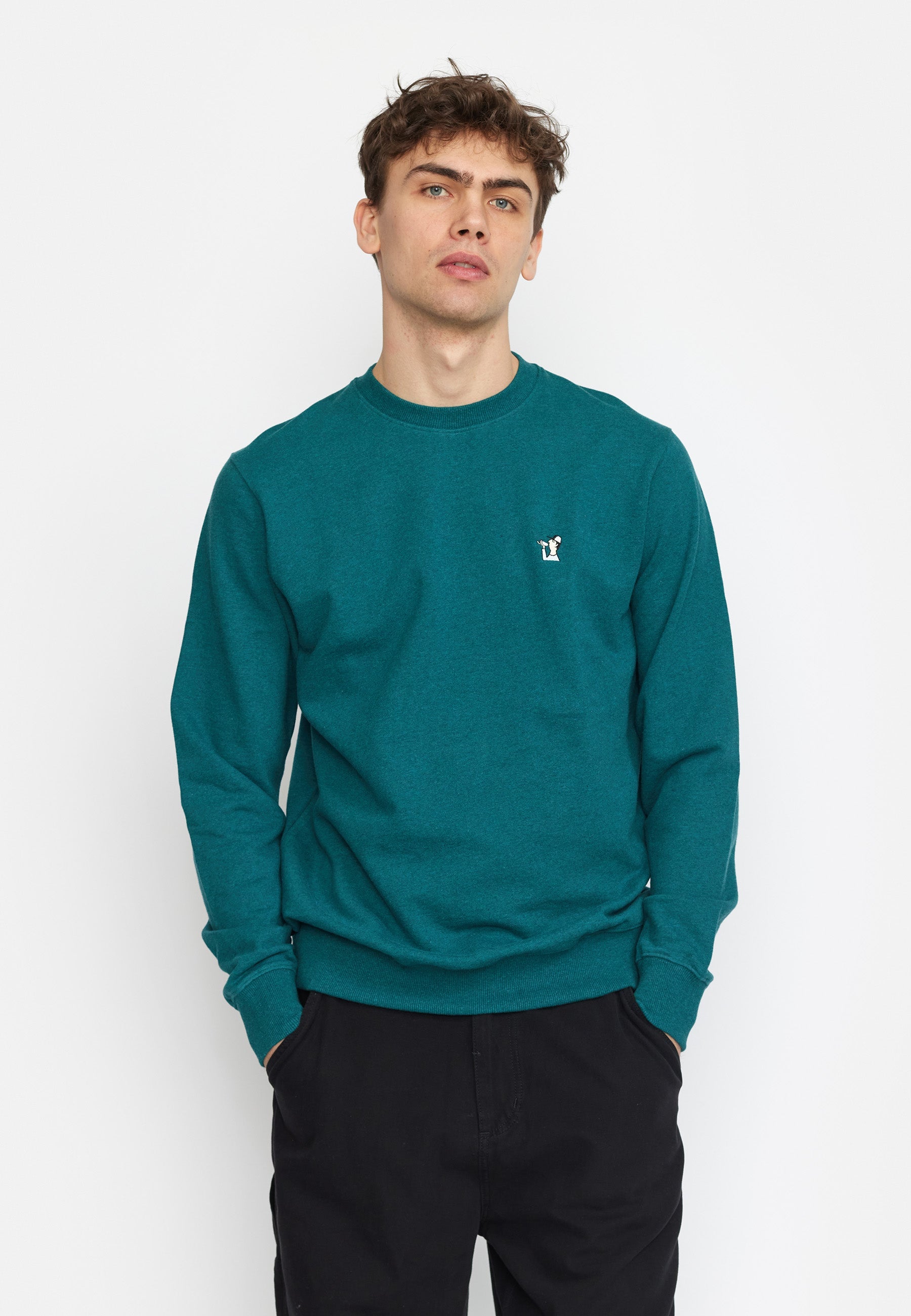 Sudadera de corte regular con cuello redondo y remates de canalé en mangas y bajo, confeccionada en tejido de algodón orgánico mélange, con un gramaje de 350 g/m². El algodón orgánico se cultiva a partir de semillas no modificadas genéticamente, sin fertilizantes ni pesticidas químicos, lo que potencia la biodiversidad y con un menor impacto en el equilibrio ecológico. La sudadera de cuello redondo presenta un pequeño bordado gráfico en el pecho, que añade un toque divertido y colorido.